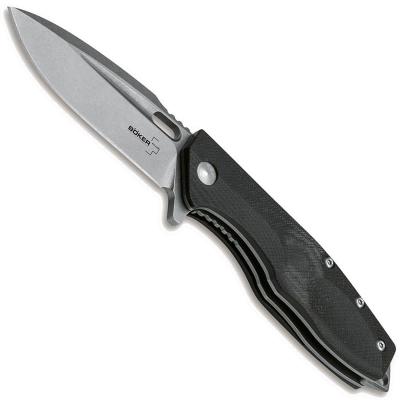 Boker Caracal Folder Mini, 3 1/8" stonewash D2 steel drop point blade with flipper; black G10 handle with liner lock, lanyard hole and reversible pocket clip, 4 1/8" closed. Made in China.