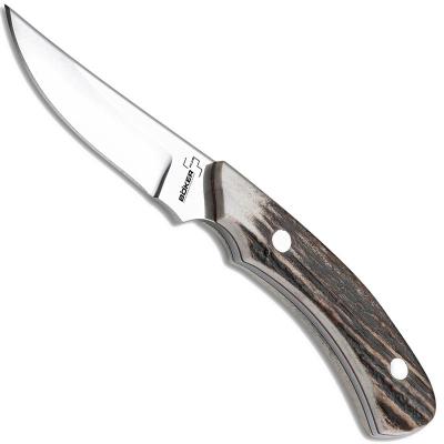 Boker Cowboy Crossdraw Knife, 2 7/8" 440C upswept fixed blade with high polish finish. Full tang with stag handle scales and horizontal carry black leather sheath, 6 3/8" overall. Made in China.