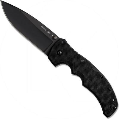 Cold Steel Recon 1 Knife, 4" CPM S35VN stainless steel spear point blade with black DLC coat and dual thumb studs; black G10 handle with Tri-Ad Lock, lanyard hole and ambidextrous pocket clip, 5 3/8" closed. Made in Taiwan.