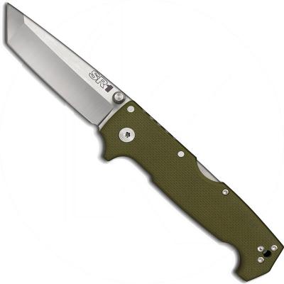 Cold Steel SR1 Knife, 4" satin CPM S35VN premium stainless steel tanto blade with dual thumb studs; OD Green G10 handle with Tri-Ad Lock, lanyard hole and ambidextrous pocket clip, 5.38" closed. Made in Taiwan.