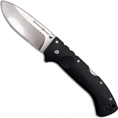 Cold Steel Ultimate Hunter, 3 1/2 inch S35VN stainless steel drop point with ambidextrous thumb stud; black G10 handle with Tri-Ad Lock, lanyard hole and ambidextrous pocket clip, 5" closed. Made in Taiwan.
