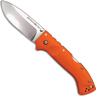 Cold Steel Ultimate Hunter, 3 1/2 inch S35VN stainless steel drop point with ambidextrous thumb stud; Blaze Orange G10 handle with Tri-Ad Lock, lanyard hole and ambidextrous pocket clip, 5" closed. Made in Taiwan.