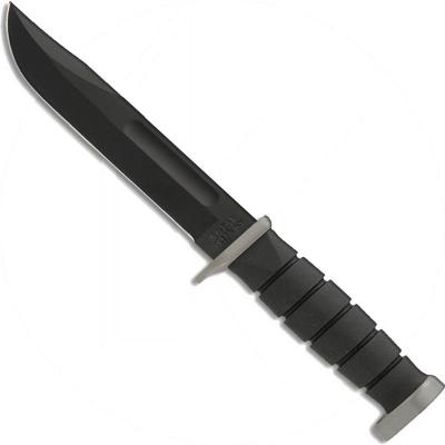 KABAR D2 Extreme Knife, 7" D2 steel clip point fixed blade with black finish; grooved black Kraton G handle with powdered metal guard and butt cap, and MOLLE compatible hard plastic sheath, 12" overall. Made in the USA.