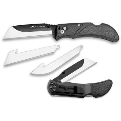 Outdoor Edge RazorWork Knife, 3.0" replaceable Japanese 420J2 stainless steel blade; black Grivory handle with black TPR inserts, lockback and steel pocket clip, 4.1" closed. Includes 2 utility blades and 1 drop point blade.